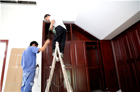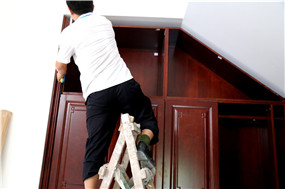 衣柜安裝現(xiàn)場(chǎng)師傅相互配合